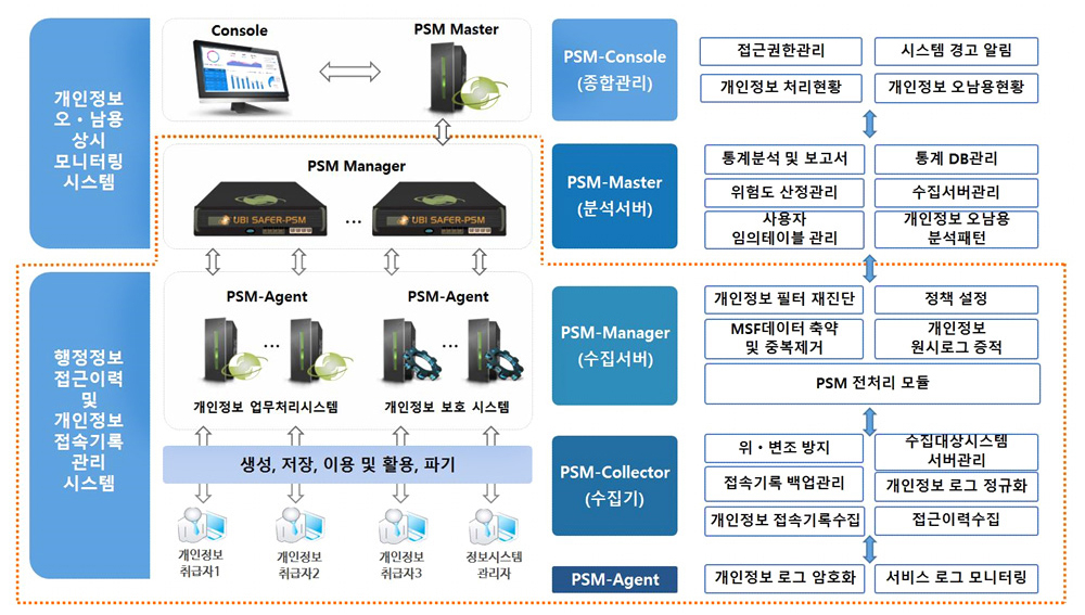UBI SAFER-PSM은 개인정보 생명주기(수집, 저장, 이용, 제공, 파기)에 따라 개인정보를 체계적으로 관리하는 개인정보 종합관리 솔루션입니다. 개인정보의 접속기록 및 개인 정보 관리 체제를 마련해 드립니다.